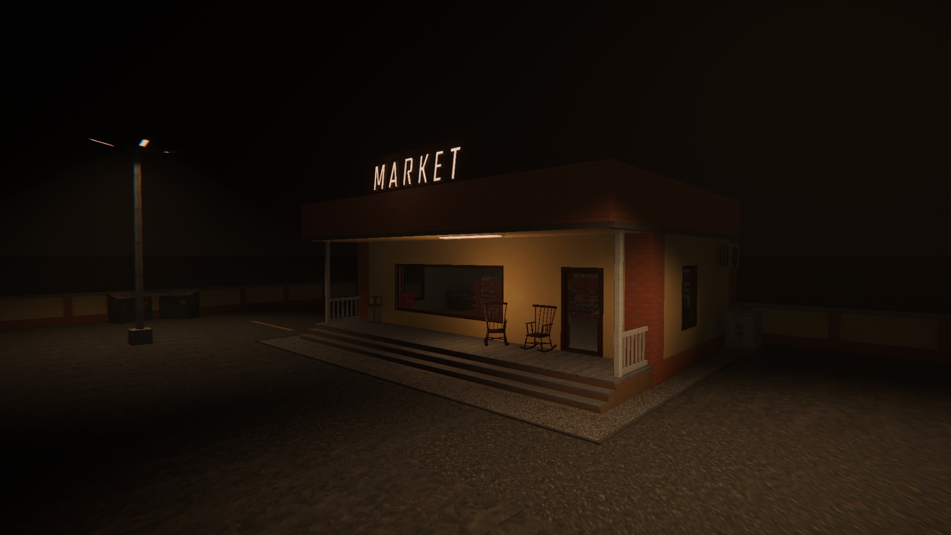 A stylized 3D environment that includes a motel and a small market area — perfect for games, renders, or animations.